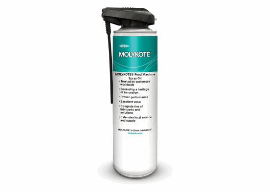 MOLYKOTE® Food Machinery Oil Spray is an NSF H1–certified multipurpose mineral oil (MO) spray lubricant for sensitive and complex food processing equipment.